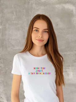 Футболка белая "Жизнь тебя душит, а ты возбуждаешься"