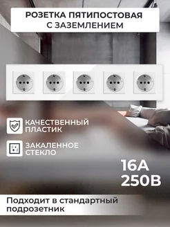 Розетка пятипостовая белая с рамкой из стекла встраиваемая
