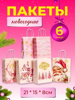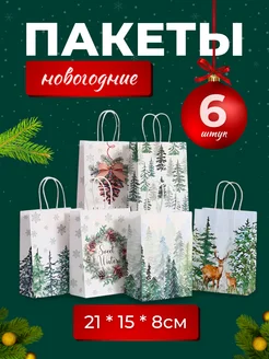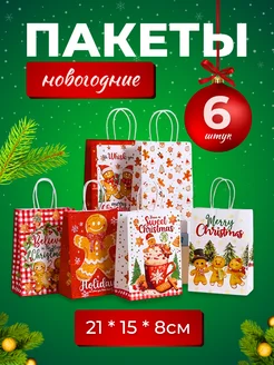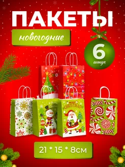 Подарочный пакет новогодний крафт, бумажный,набор 6 штук
