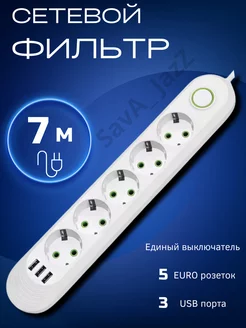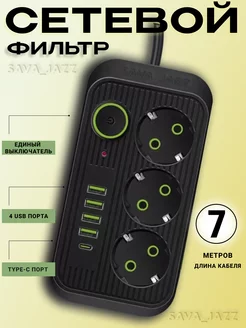 Сетевой фильтр 7 метров 3 розетки 3 USB+Type-C
