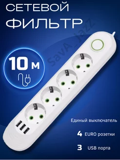 Сетевой фильтр 10 метров 4 розетки 3 USB