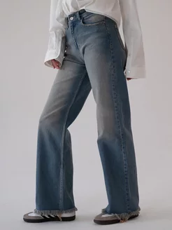 Джинсы широкие высокая посадка с бахромой