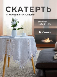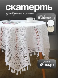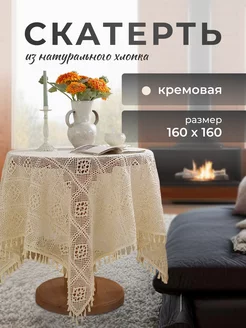 Скатерть тканевая прямоугольная на стол кружево и лен