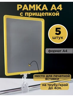Рамка А4 на держателе-прищепке, желтая, с карманом, 5 шт