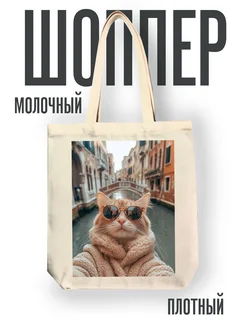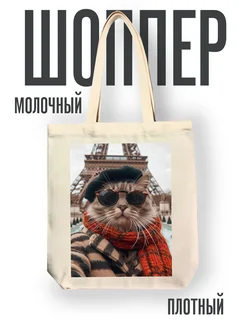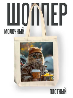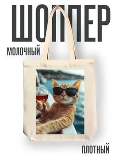 Шоппер тканевый светлый белый с принтом Кот кошка хлопок