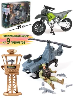 Военный набор Солдатик с вертолетом, мотоциклом и вышкой