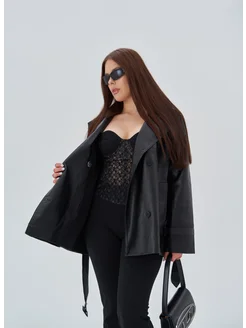 Тренч плащ короткий из экокожи оверсайз на весну 2025