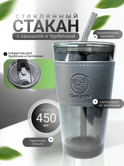 Стакан стеклянный с трубочкой и крышкой 450мл
