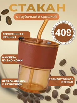 Стакан стеклянный с трубочкой и крышкой 400мл
