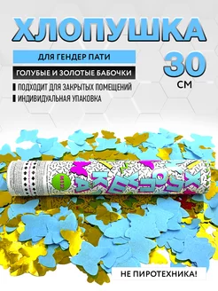 Пневмохлопушка 30 см для гендер пати голубые золотые бабочки