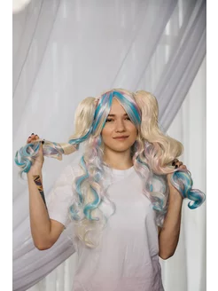 Карнавальный разноцветный парик с двумя шиньонами Единорог