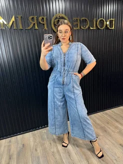 Комбинезон джинсовый со стразами и поясом на резинке