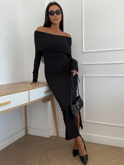 Платье лапша вечернее с открытыми плечами и разрезом