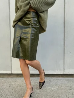 Юбка кожаная зернистая до колена с разрезом вечерняя