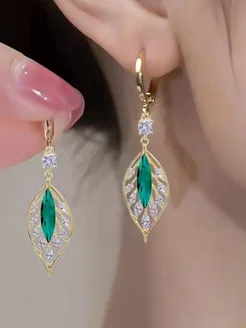 Серьги Листок с изумрудным кристаллом и цирконами