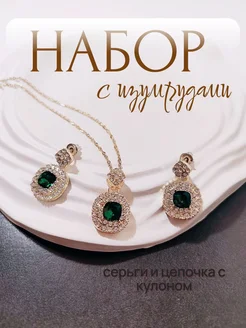 Комплект серьги и кулон с изумрудными кристаллами