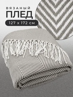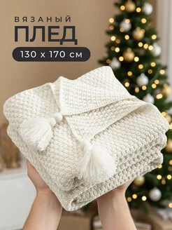 Плед вязаный бежевый с бахромой и кисточками на диван