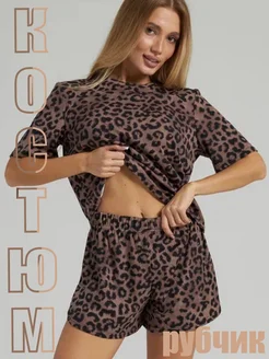 Пижама с шортами леопардовая, костюм домашний в рубчик