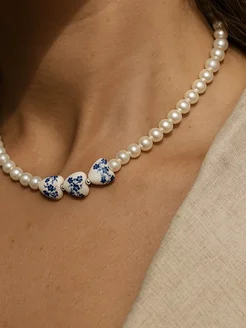 Чокер на шею из жемчуга с синими бусинами гжель, колье