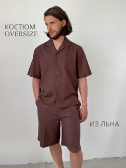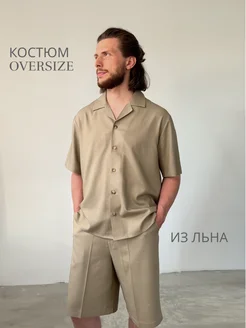пляжный летний костюм двойка с шортами и рубашкой из льна