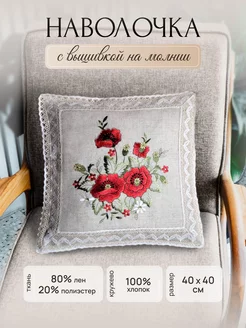 Наволочка декоративная с кружевом и вышивкой "Маки"