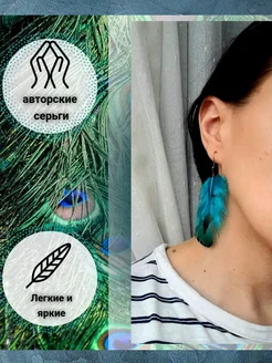Серьги перья длинные бирюзовые, бижутерия
