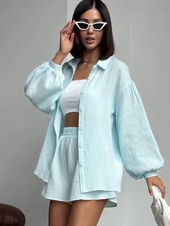 Летний муслиновый костюм с шортами и рубашкой двойка