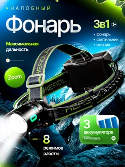 Фонарь налобный 3в1 аккумуляторный мощный со светодиодом