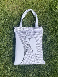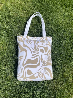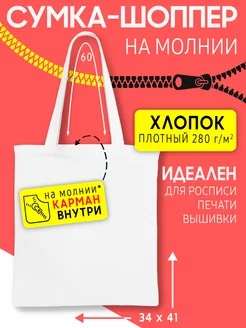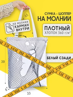 Шоппер белый с принтом на молнии, с карманом, тканевый