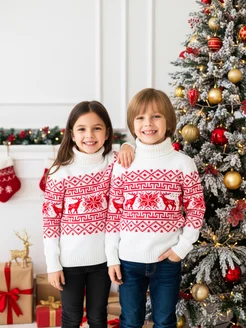 Свитер с горлом новогодний с оленями шерстяной Family look