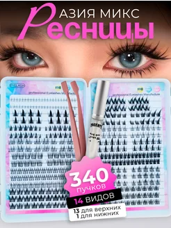 Набор ресниц с клеем и пинцетом пучки аниме 10-14 мм коричне…