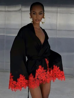 Халат домашний кимоно шелковый с кружевом