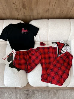 Новогодняя пижама в клетку со штанами, шортами и топом набор
