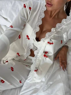 Пижама 3 в 1 со штанами и шортами шелковая с кружевом