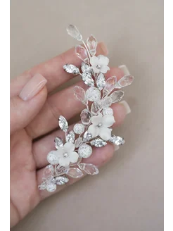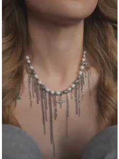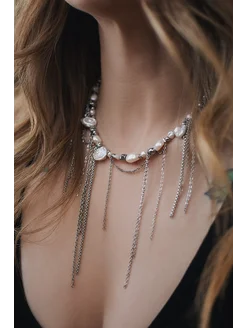 Колье с барочным жемчугом, гематитом и серебристыми цепями