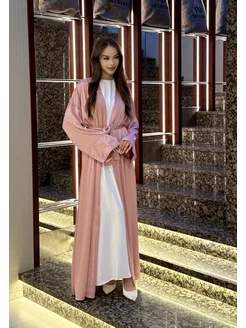 Накидка абайя мусульманская розовая с камнями и поясом 2025