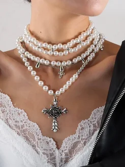 Жемчужное ожерелье многослойное чокер с крестом 3 в 1 y2k