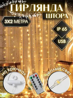 Гирлянда штора на окно 3х2 с пультом USB теплый свет