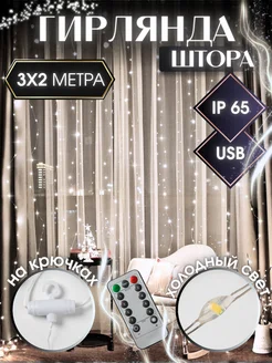 Гирлянда штора на окно 3х2 с пультом USB на крючках