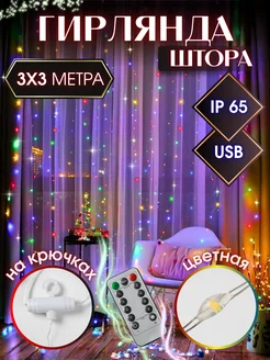 Гирлянда штора на окно 3х3 с пультом USB цветная