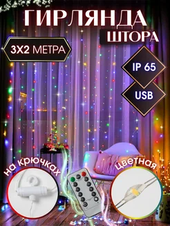 Гирлянда штора на окно 3х2 с пультом USB цветная