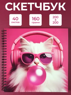 Скетчбук для рисования квадратный на кольцах розовый кот