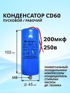 Конденсатор пусковой 200мкФ 250В CD60 провода шпилька М8