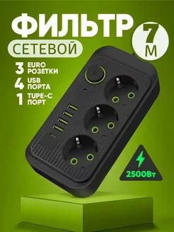 Сетевой фильтр на 3 евро-розетки и 4 USB кабель 7м