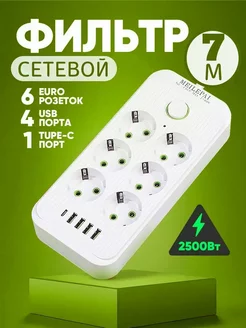 Сетевой фильтр на 6 евро-розетки и 4 USB кабель 7м