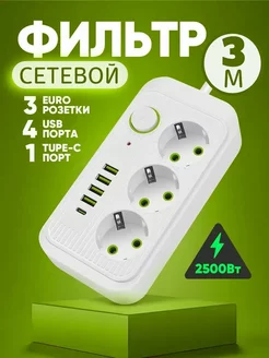 Сетевой фильтр на 3 евро-розетки и 4 USB кабель 3м