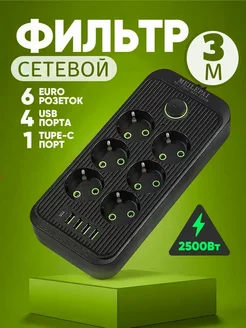 Сетевой фильтр на 6 евро-розетки и 4 USB кабель 3м