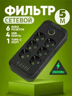 Сетевой фильтр на 6 евро-розетки и 4 USB кабель 5м