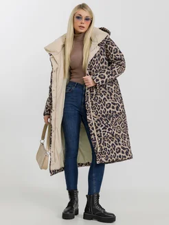 Пуховик зимний длинный с капюшоном и принтом леопард