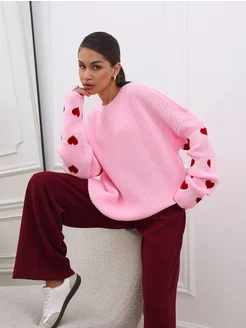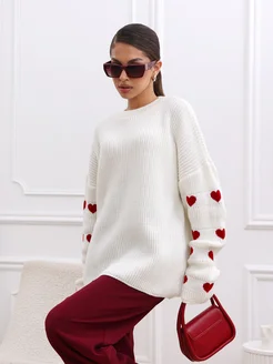 Свитер оверсайз длинный вязаный с сердечками